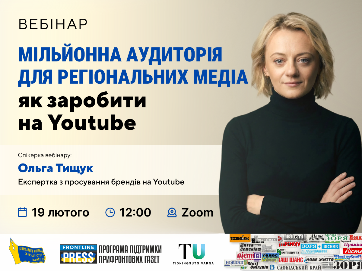 Національна спілка журналістів України запрошує представників регіональних медіа до участі у вебінарі «Мільйонна аудиторія для регіональних медіа: як заробити на YouTube», який відбудеться 19 лютого, четвер, о 12.00 на платформі ZOOM.