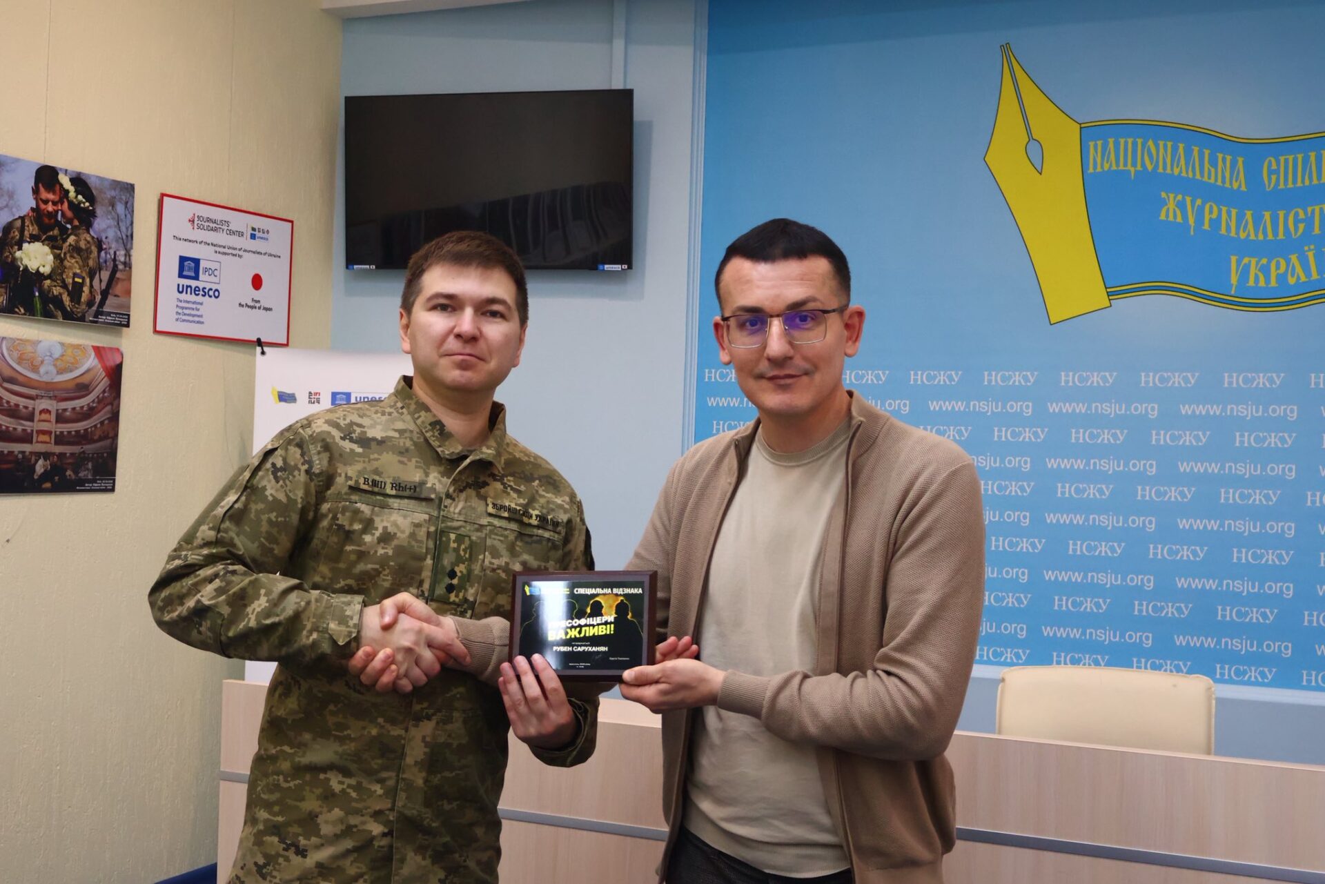 «Саме тому я з особливою гордістю вручив Рубену Саруханяну, пресофіцеру 5-ої окремої штурмової Київської бригади, спеціальну відзнаку «Пресофіцери важливі» від Національної спілки журналістів України, – наголошує голова НСЖУ Сергій Томіленко. – Ця відзнака – для тих, хто допомагає журналістам-воєнкорам робити їхню небезпечну роботу, убезпечує їх і створює умови, щоб правда доходила до світу. Хто документує героїзм наших захисників і захисниць».