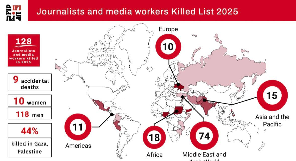 Міжнародна федерація журналістів (IFJ) оприлюднила фінальний список загиблих у 2025 році: у світі вбили 128 журналістів і медійників.
