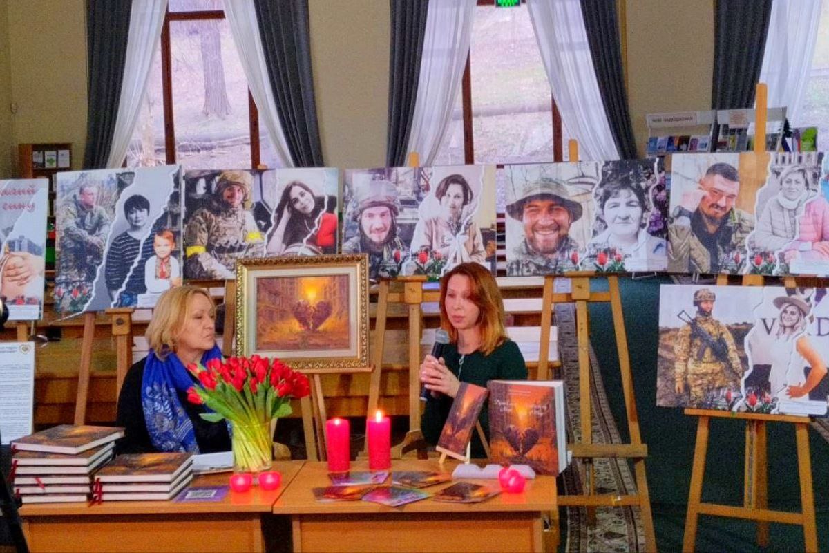 Також у залі бібліотеки демонструвалася ініційована Вікторією Колмиковою виставка з 22 фотоколажів  матерів та їхніх полеглих синів. І, звісно, тюльпани – символи Маріуполя – яскравіли червоно цього зимового дня – символом з Маріуполя, де навесні 2022 крізь руїни міста, з землі, просоченій кров’ю та болем захисників й маріупольчан, вони розквітли свідченням сили життя України і як спогад про те, що у мирні часи парки міста були буквально вкриті яскравими «килимками» з цих квітів.А ще – мами Героїв  символізують тюльпани з душами своїх полеглих синів.