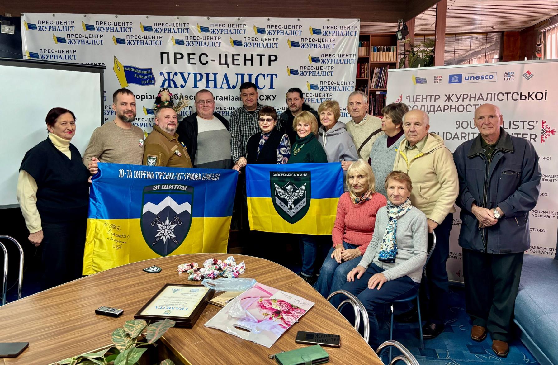 Ветерани війни вручили Почесні Грамоти голові ЗОО НСЖУ, співкоординаторці Центру Наталії Кузьменко з подякою за плідну спільну працю на інформаційному полі та прапор 110 бригади ТРО Запорізькі сапсани». А журналісти ЦЖС подарували військовим вироби в національному стилі – кишенькові ляльки-мотанки, колоски-ордени та маки Перемоги.