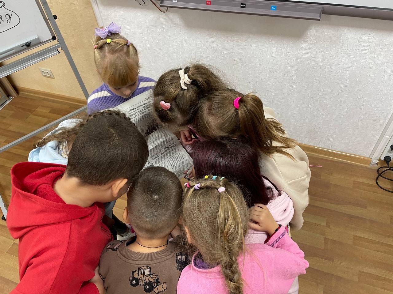 На фото гуртківці – діти ВПО з Лимана та інших міст, розглядають своє фото у газеті з гордістю, бо про їхню перемогу у конкурсі випустили цілу статтю
