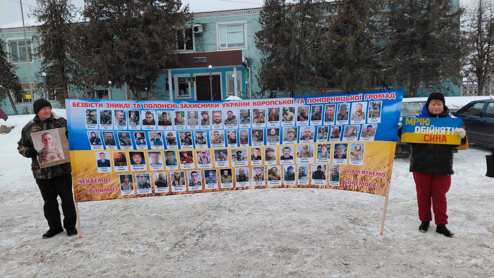 Уже рік у Коропі (Чернігівська область) проходять щотижневі мирні акції на підтримку військовополонених та зниклих безвісти захисників України, які походять з Коропчанської та Понорницької громад. Перша лютнева акція 2026 р – знакова, бо саме дев’ятого лютого ця ініціатива стартувала минулоріч. Акція проходить практично щонеділі. Нинішнє зібрання є особливою також і тим, що у ньому вперше було використано виразний символ – прапор України зі світлинами 70-ти місцевих воїнів, які опинилися у полоні або зникли безвісти. Авторка прапору – Ольга Гавриленко (село Черешеньки), син якої вже четвертий рік у ворожому полоні.