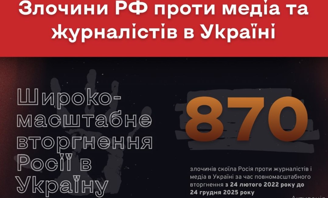 Проти журналістів та медіа з початку повномасштабного вторгнення в Україну – а а це 3 роки й 10 місяців – росія скоїла 870 злочинів. Зокрема, за листопад – грудень зафіксовано два злочини проти медіа та журналістів, які скоїла Росія. Йдеться про випадки пошкодження редакцій медіа та судовий тиск на утримуваних Росією українських журналістів.