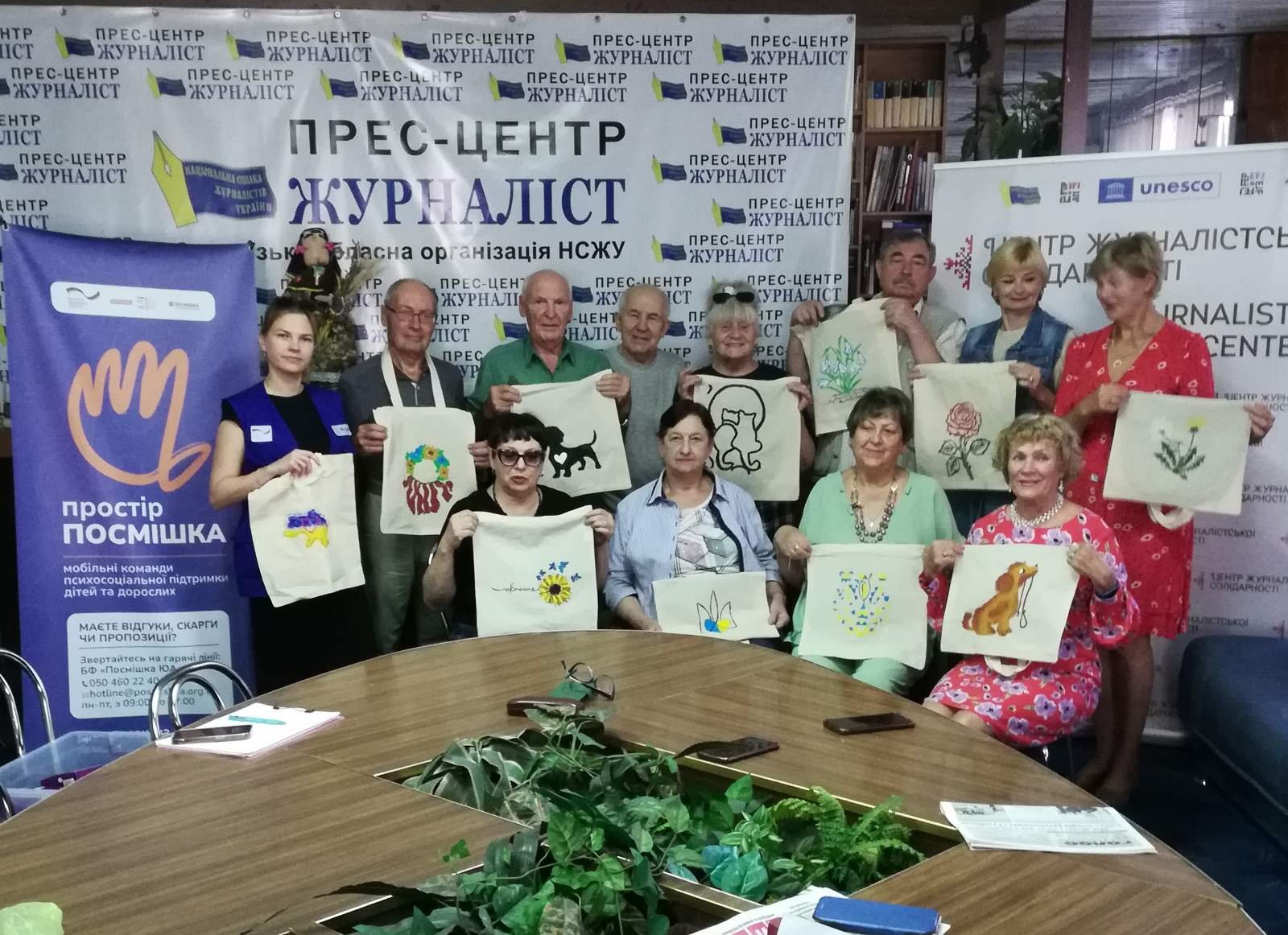 Вікторія Галімон та Ганна Петренко – досвідчені психологині з Благодійного Фонду «Посмішка.UA» – часті гості у Запорізькому Центрі журналістської солідарності НСЖУ. І щоразу навчають медійників якимось новим практикам. Минулого разу учасники тренінгу  засвоювали такий спосіб, як нейрографіка. Тепер – розпис  шоперів.