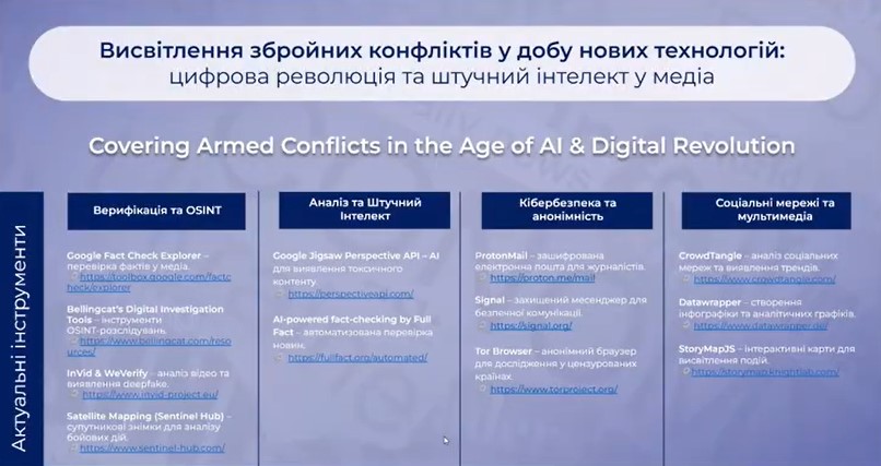 – НСЖУ спільно з міжнародними лідерами галузі створили перелік інструментів для журналістів, які працюють у воєнних зонах. Це практичні інструменти, котрі мають зробити діяльність медійників ефективнішою, адже сьогодні журналісти працюють в умовах, коли інформаційні технології змінюють не тільки спосіб збору інформації, а й її подачу, аналіз, безпеку, і особливо це актуально у висвітленні збройних конфліктів. Швидкість і достовірність інформації – критично важливі, – підкреслила Катерина Тесленко.