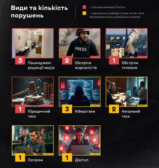 У листопаді 2025 року Інститут масової інформації (ІМІ) зафіксував 14 випадків порушення свободи слова в Україні. Більша частина цих злочинів –  сім випадків –  була вчинена Російською Федерацією. Російські воєнні злочини проти медіа охоплювали обстріли журналістів, пошкодження редакцій та телевеж, а також юридичний тиск на медійників в окупації. Про це свідчать дані щомісячного моніторингу ІМІ «Барометр свободи слова».