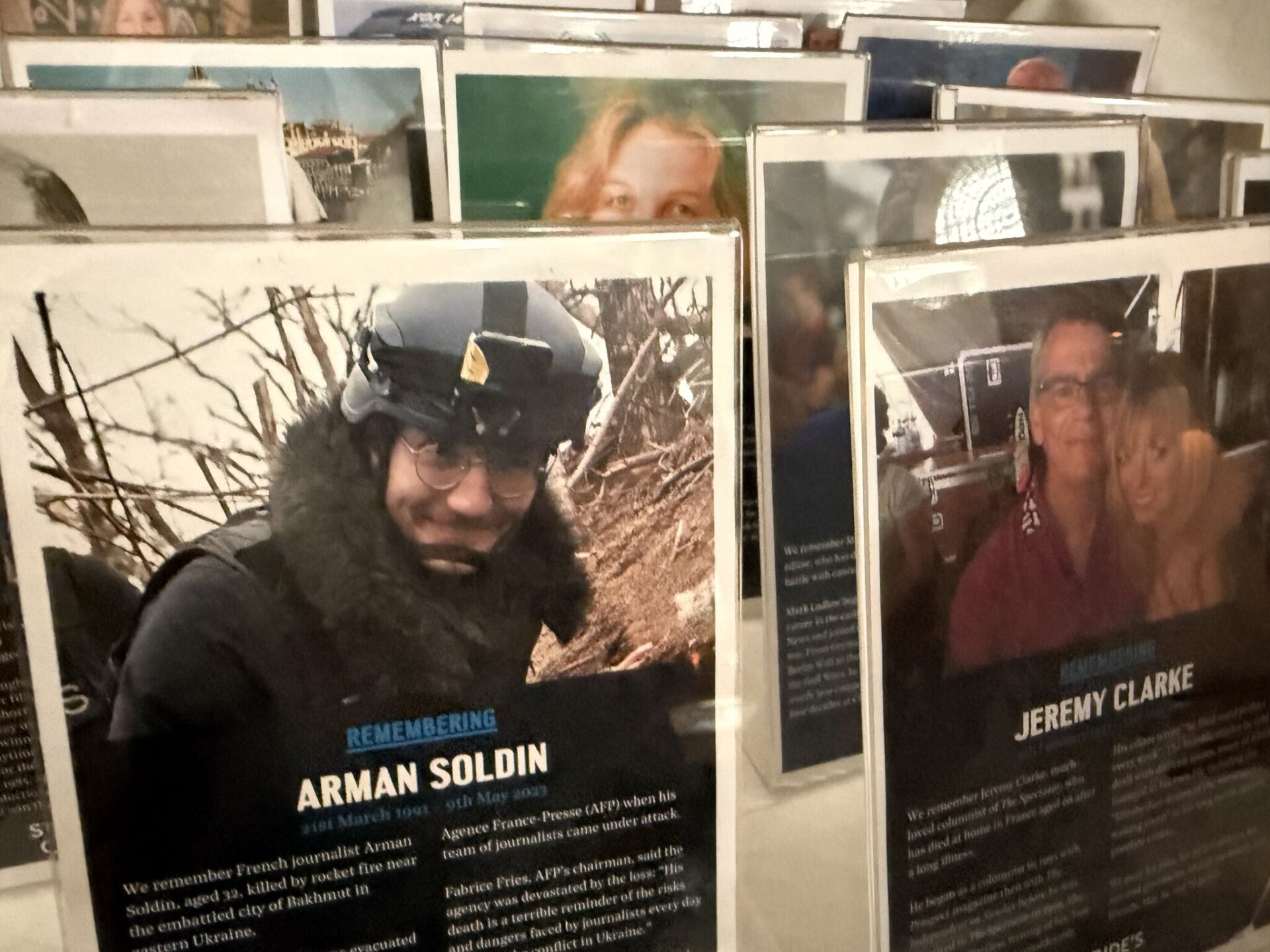 Усередині — вівтар, присвячений журналістам, які загинули в зонах конфліктів. Десятки меморіальних дощок вкривають стіни. Імена та обличчя з воєн і криз різних десятиліть і континентів.